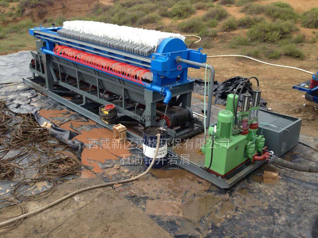 運行情況:該項目使用YB250-30液壓柱塞泥漿泵5臺,XYZG300-125壓濾機5臺,日處理打樁污水污泥2000噸,打樁污水污泥經過振動篩過濾將5毫米以上碎石和雜質除掉,然后加藥沉淀,沉淀后污泥經過柱塞泥漿泵進入壓濾機過濾,過濾壓力10公斤經過30分鐘過濾,濾餅含水率達到20-25%左右,泥餅成型即可卸料。